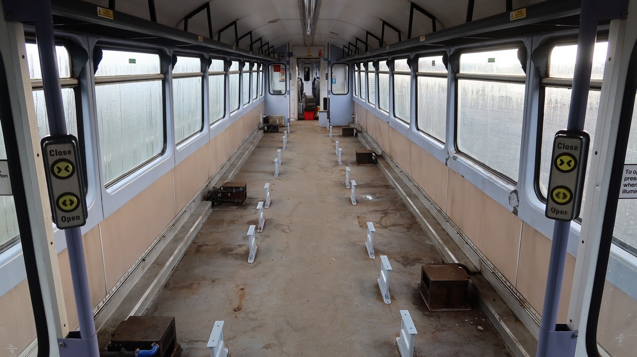 Preservation Information 144016 required some repair works which prevented it from entering preservation service, with the bodywork leaking which caused damage to the interiors. In early 2023, work to refurbish the unit for passenger service began. A broken coil spring on 55839 was replaced in early 2024. The seating layouts in 55839 and 55852 were then modified, to give more space between the seats and several rows have been turned around to provide bays of four seats. The interiors of these two cars were largely repainted. In May 2024, 144016 made its passenger debut at the railway's first Pacer Gala/Running Day. The splitter gearbox on 55852 was replaced in October 2024. Whilst still in service with Northern, some of the doorway floors had begun to distort and this began to hinder reliable operation of the doors. By September 2025, nine of the ten doorway floors had been replaced. All three cars had their bodyside Northern livery repainted, with vinyl lettering being reapplied. A small team continues to work on the unit regularly. The underframe equipment is also being painted as time allows, and vinyl lettering is being reapplied. All painting is done outside as shed space is currently extremely limited. |