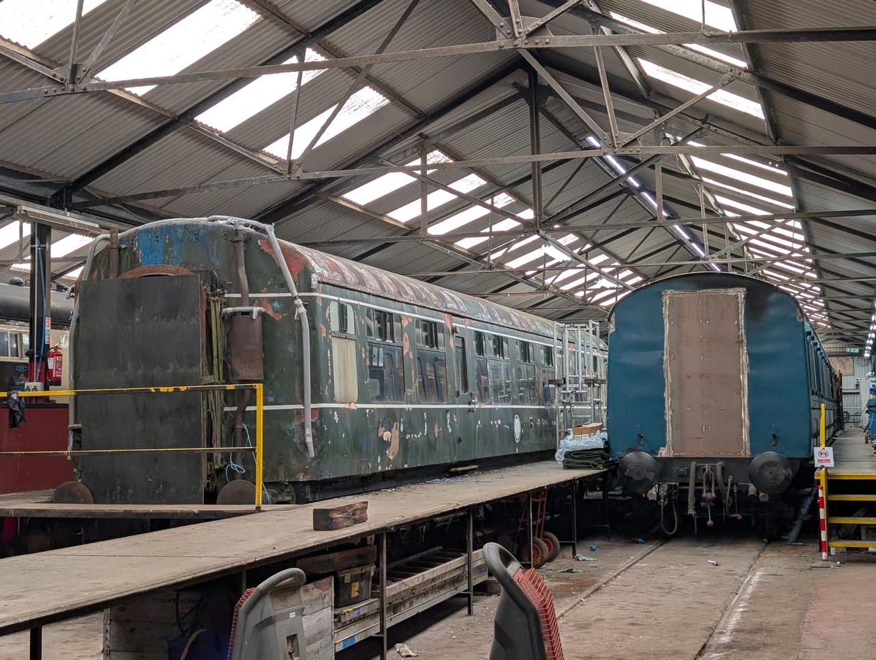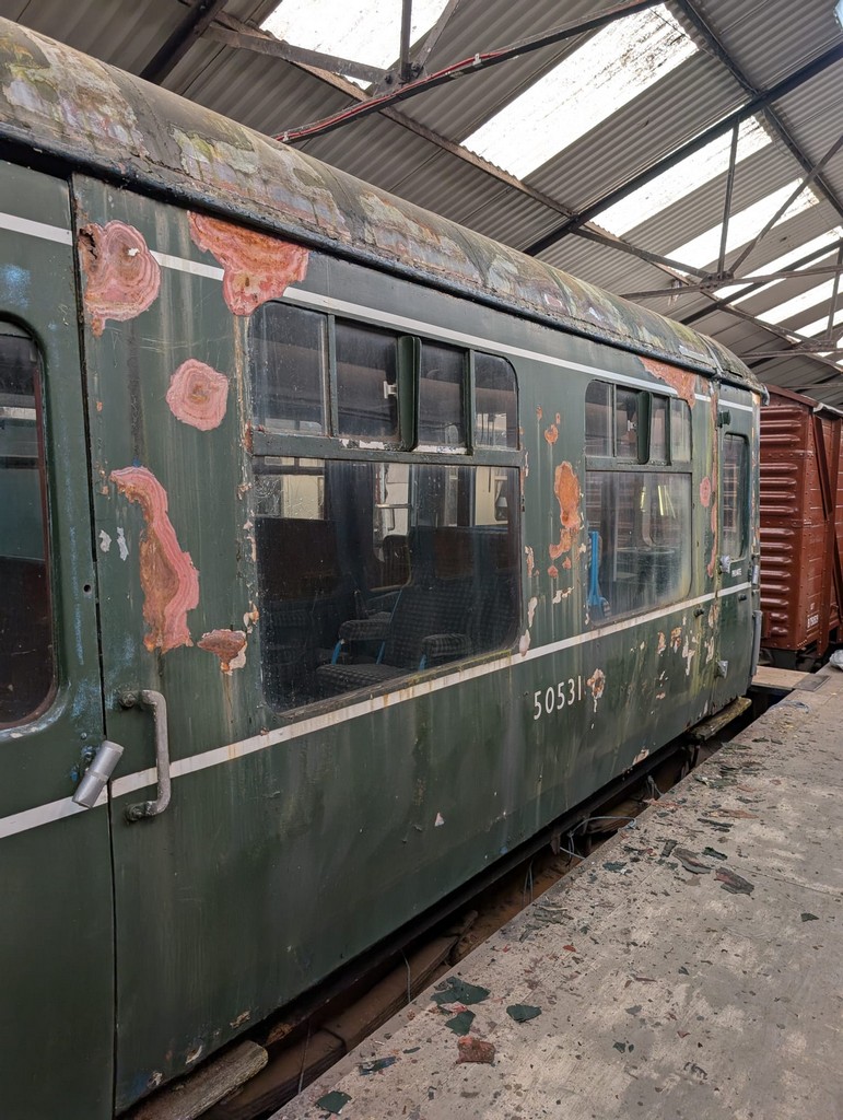 Preservation Information 50531 was preserved as a spares vehicle and was originally to be broken up to provide parts for other 104 vehicles. However, an offer from a private individual to look after the set resulted in the vehicle being retained and returned to serviceable condition, working with partner 50479. In 1999 the set was moved to the Telford Steam Railway where it was soon put into traffic. Whilst there 50531 received much restoration work and a repaint into BR Blue livery. In the mid 2000s, new fire extinguisher regulations forced the set out of service (as a powered DMU), however the set continued to be used as hauled stock being propelled by some of the railway's small steam and diesel locomotives. However the group who were looking after the unit disbanded when the set stopped being used under its own power, which in some ways proved to the the start of the end. In 2009, 50531 was repainted into BR Green by the railway's "general volunteers" in an effort to tidy the declining exterior appearance. More serious work was required by this point, however the resources adn skills were not available to undertake this. Nevertheless, the repaint tidied the vehicle up considerably. In 2011, attempts were made to return 50531 to use "as a DMU" again. Unfortunately, problems with the engines meant the plan failed. Not long after, the vehicle was taken out of use, as passenger services were being handled by partner 50479 in push/pull form. In 2014, 50531 was removed from store and made a very rare appearance in service when used for a branch line society tour hauled by an industrial diesel loco. The vehicle was used as the society specially requested it, because it faced the opposite way to 50479 and was more attractive to the group who had chartered the railway and required the train to traverse specific sidings not normally in passenger use. This was to be the last day 50531 operated at the Telford Steam Railway. During the late 2010's the vehicle was stored, and then suffered several vandal attacks, with windows smashed and the interior entered. Volunteers did their best to resecure the vehicle where possible. By 2019, 50531 was no longer watertight. The owning group made a brief visit to gather together any parts which had been removed/dispersed and cover the vehicle over with a tarpaulin. This was to both deter future occupants and to try and keep the water ingress at bay. Some years in storage followed until Autumn 2023 when 50531 finally left Telfordending a 25 year association between the railway and first generation DMU's. The vehicle was moved to "104 HQ" at the East Lancashire Railway for further storage and for a final decision to be made on its future. |
